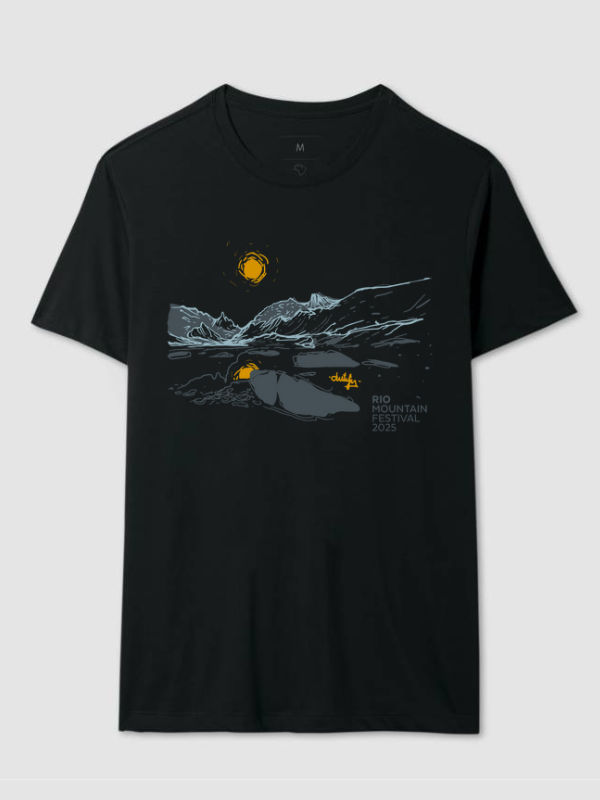 Camiseta do Rio Mountain Festival 2025, 100% algodão, com ilustração de DrilifyArt. Arte criada a partir de uma foto da Patagônia, de Luan Chaves, vencedor do Concurso Fotográfico 2024.